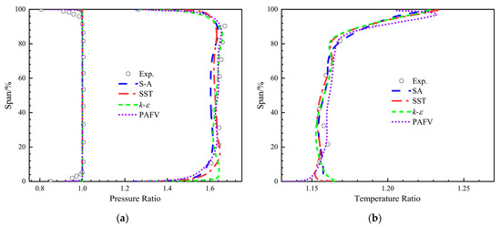 Figure 9 shows the radial distribution of the total pressure ratio and total temperature ratio calculated by the four turbulence models at near–peak efficiency conditions. Figure 9a shows the radial distribution of the inlet and outlet total pressure ratio under near peak efficiency conditions. Inlet and outlet pressure ratios derived by the four turbulence models at peak operating conditions do not significantly differ, as seen in Figure 9a, and the general trend coincides well with the actual results, with a few minor deviations in the specifics. The PAFV turbulence model’s pressure ratio curves are closest to the experimental results at the outlet, and the results of the other three turbulence models are also comparable. However, the k-ɛ turbulence model performs slightly worse at the root of the blade near the hub, which may be because it does not accurately represent the flow characteristics of the high–shear stress region close to the wall. Figure 9b shows the radial distribution of the total outlet temperature for near–peak efficiency conditions, and it can be seen from the figure that the total temperature ratios calculated by all four turbulence models are in good agreement with the experimental results.