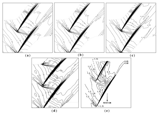 Figure 11 shows the calculated results of the Mach number distribution inside the 70% blade height channel compared with the experimental results. The four turbulence models’ calculated results are consistent with the flow characteristics inside the transonic rotor, according to Mach number cloud plots at various blade heights. The numerical results are also in good agreement with the experimental results, and the flow field characteristics are essentially consistent with the development trend. In the flow field channel at 70% blade height, normal shock waves and oblique shock waves occur, and the pressurization of the transonic flow is accomplished by these two shock waves. The obvious interference phenomenon of the shock–boundary layer interaction also arises on the suction surface of the blade in the flow field channel at 70% of the blade height.