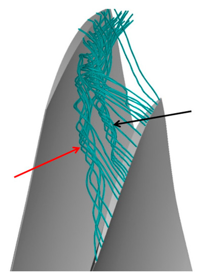 When the Rotor 67 rotor is operating at a point close to its peak efficiency, as illustrated in Figure 13, the flow field at the top gap of the blade predicted using the PAFV turbulence model can be seen, and the tip leakage vortex is indicated by the red arrow in the figure. The second tip leakage vortex is shown by the black arrow, which is consistent with the two Mach number fluctuations fluctuating in the middle of the 30–70% blade at the 50% pitch 90% blade height in Figure 10a. The reason for its generation may be caused by the shock–boundary layer interaction. The shock–boundary layer interaction basically occurs at the same location where the second blade tip leakage vortex is generated. This interaction results in a local separation because of the shock–boundary layer interaction, and this separation causes the blade tip leakage flow to roll up the second blade tip leakage vortex.