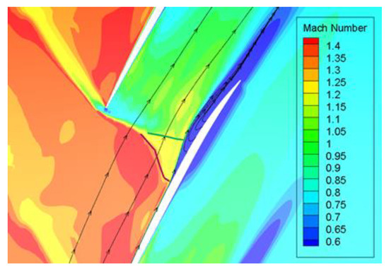 The shock–boundary layer interaction phenomenon on the blade suction surface at the peak efficiency point calculated using the PAFV turbulence model is seen in Figure 14. According to the calculation results, obvious transonic flow develops in the compressor under higher back pressure circumstances, and the shock–boundary layer interaction phenomenon is clearly visible on the suction surface of the blades. The inverse pressure gradient generated by the shock wave caused the boundary layer to thicken on the suction surface of the blade, and there is a certain separation so that the shock wave near the suction surface is firstly shifted upstream to form the first shock wave, and then the second shock wave is formed at the location of the maximum separation. The whole surge has a “λ” shape, which is a typical phenomenon in the shock–boundary layer interaction.