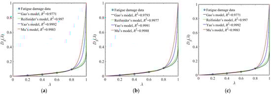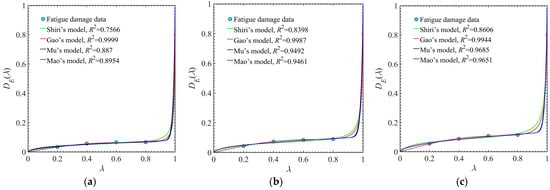 Fitting curves of strength-based fatigue damage models: (a) S = S2; (b) S = S3; (c) S = S4.