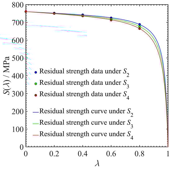 Residual strength is defined as the resistance of a composite material to fatigue fracture after a given cycle ratio, which is generally measured through a destructive testing method [,]. According to Equation (1), the residual strength of a composite material can be expressed as