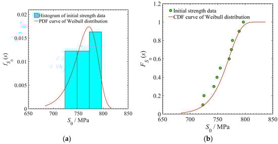Based on the initial strength data listed in Table 5, the maximum likelihood estimation method is adopted to calculate the parameters in Equation (4). The parameter calculation results show that  and . Accordingly, the probability density function (PDF) and CDF of the initial strength of the Gr/PEEK [0/45/90/−45]2S laminates are plotted, as shown in Figure 4.