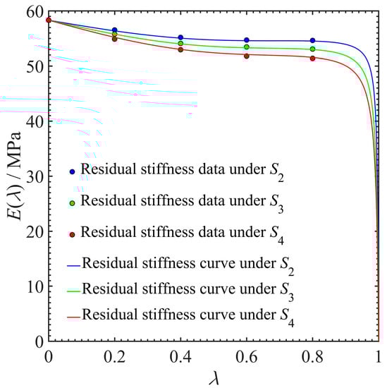 Residual stiffness is defined as the ability of composite material to resist elastic deformation after a given cycle ratio. In engineering practice, residual stiffness is usually measured through a non-destructive testing method, which makes it possible to continuously observe the fatigue damage state of a composite material []. According to Equation (2), the residual stiffness of a composite material can be formulated as