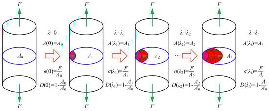 In Figure 9, the cylinder represents a specimen subjected to the axial tension–tension loading. The area of the blue circle represents the initial bearing area of the specimen, denoted as . The red crescent-shaped area indicates the development of fatigue damage, and it grows with the cycle ratio;  is the effective bearing area of the specimen when the cycle ratio equals . Similarly,  and  are the corresponding effective stress and accumulated fatigue damage, respectively. Note from Figure 9 that fatigue damage of the specimen accumulates with the increase in the cycle ratio. The effective bearing area of the specimen gradually decreases with the development of fatigue damage. Under such circumstances, the effective stress grows with the decrease in the effective bearing area. The following will explain the effective stress growth mechanism from the perspective of theoretical derivation.