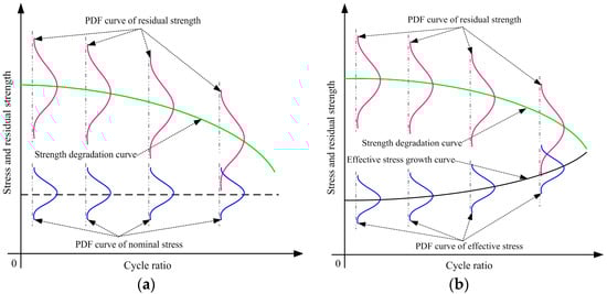 A great deal of research that focused on the fatigue reliability of composite materials has been conducted, and many strength-based and stiffness-based fatigue reliability approaches have been presented [,,]. It should be noted that the existing fatigue reliability approaches mainly focus on the performance degradation path and its probabilistic features. The growth of effective stress and critical stiffness caused by accumulated fatigue damage is ignored in the existing studies. In essence, fatigue damage accumulation will not only cause the degradation of material performance, but also lead to an increase in effective stress and critical stiffness. In addition, the existing studies do not systematically compare and discuss the differences between strength-based and stiffness-based fatigue reliability approaches. To this end, a pair of probabilistic models of residual strength and residual stiffness are proposed in this study. The growth mechanisms of effective stress and critical stiffness are elaborated from the perspective of load-bearing capacity. The combined effects of performance degradation and effective stress growth are considered, and a pair of strength-based and stiffness-based fatigue reliability approaches are presented. Moreover, the fatigue reliability and failure rate of composite laminates under different conditions are compared and discussed.