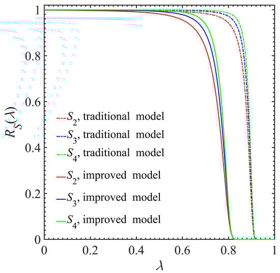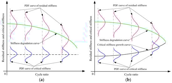 In Figure 14, the red curves represent the PDFs of residual stiffness under different cycle ratios. The green curve presents the stiffness degradation path of the composite material from the perspective of mean value. The blue curves represent the PDFs of critical stiffness under different cycle ratios. The black curve in Figure 14b represents the growth path of critical stiffness. For the traditional model, it is generally considered that the PDF of critical stiffness is unchanged during the fatigue process, as shown in Figure 14a. As mentioned in Section 4.2, the critical stiffness increases with the accumulation of fatigue damage. Moreover, fatigue damage is usually treated as a function of the cycle ratio. Accordingly, we can conclude that the PDF of critical stiffness changes with the cycle ratio, as shown in Figure 14b. However, the increase in critical stiffness caused by accumulated fatigue damage is always ignored in the traditional model, which will result in a large deviation of the reliability analysis results.
