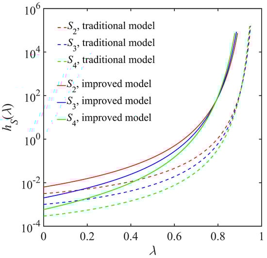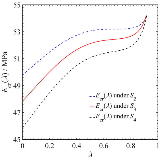 To overcome the disadvantages of the traditional model, the increase in critical stiffness caused by accumulated fatigue damage is considered in the improved model. By substituting Gao’s model (i.e., Equation (2)) into Equation (22), the critical stiffness of a composite material can be expressed as
