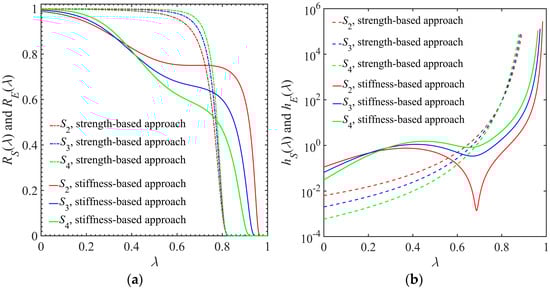 Figure 18 shows that the fatigue reliability and failure rate curves of these two approaches are significantly different. The strength-based fatigue reliability curve presents two distinct stages, while the stiffness-based fatigue reliability curve has three different stages, as shown in Figure 18a. In addition, the strength-based fatigue reliability is higher than the stiffness-based fatigue reliability when the cycle ratio is , while the former is less than the latter when . Note from Figure 18b that the strength-based failure rate curve shows a monotonic growth trend, while the stiffness-based failure rate curve is similar to but different than the bathtub shape. Moreover, the strength-based failure rate is less than the stiffness-based failure rate when the cycle ratio is , while the former is larger than the latter when . As a matter of fact, the strength-based approach evaluates the reliability of a composite material from the perspective of resistance to fatigue fracture, while the stiffness-based approach evaluates the reliability of a composite material from the perspective of resistance to elastic deformation.