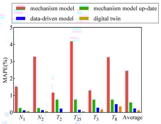 Figure 13 that the mechanism model without degradation updates exhibits significant errors compared to the actual engine output. Although the mechanism model with degradation updates can better reflect the changing trend of the gas path parameters, there are still certain deviations in its output. This is because the mechanism model considers relatively ideal conditions and cannot differentiate the influence of factors such as the measurement noise and external environment in the data, thus making it difficult to achieve an accurate prediction of the engine gas path parameters. On the other hand, the data-driven model shows good predictive results, effectively reflecting the changing trend of the gas path parameters in the aeroengine. This is because the data-driven model can dynamically learn based on historical and current data, providing stronger real-time capability. Moreover, the data-driven model can incorporate the influence of the measurement noise and external factors during the learning process. However, the data-driven model is a black-box model that cannot provide the changing trend of the engine’s unmeasurable data (such as the component characteristic parameters). In comparison, the digital twin approach demonstrates the best prediction results for the gas path parameters, which are closer to the actual data. Furthermore, to better demonstrate the superiority of the proposed digital twin framework, we compared the mean absolute percentage error (MAPE) of the predicted values from different models. The formula for calculating the MAPE is as follows: