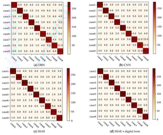 Table 9, it can be observed that the overall diagnostic accuracies of the DBN, CNN, and SSAE are 88.6%, 90.1%, and 92.5%, respectively. Among them, the SSAE has a higher accuracy compared to the DBN and CNN. This is because the SSAE applies sparsity constraints to the outputs of each hidden unit, limiting the model’s complexity and reducing the risk of overfitting, thereby improving the generalization performance of the model. The overall accuracy of the digital twin
