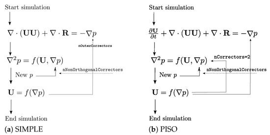 Segregated solution of the fluid transport for incompressible flows in the Finite Volume Method for steady and unsteady problems: (a) Semi-Implicit Method for Pressure-Linked Equations (SIMPLE) and (b) Pressure Implicit with Splitting of Operator (PISO). Each equation implies the solving of a large sparse linear system.