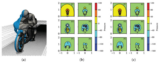 Contour plots of the pressure variations across different equally-spaced cross-sections of the studied case. Mesh size: M (18 M cells). (a) Computational mesh (M); (b) CPU; (c) GPU.