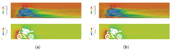 Contour plots of pressure and velocity fluctuations in the symmetry plane of the investigated case. Mesh size: M (18E6 cells). (a) CPU and (b) GPU. Pressure is denoted as the pressure differential relative to the ambient atmospheric pressure.