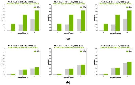 Strong scalability (Ahmdal’s Law) calculated across three tested grids (S, M, L). The simulation conducted with eight CPU cores served as the reference benchmark. (a) PCG-DIC (CPU) vs. AMG-PCG (GPU) and (b) GAMG (CPU) vs. AMG-PCG (GPU).