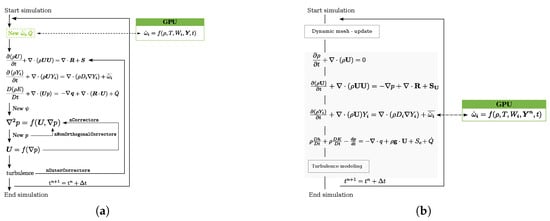 Solution methods employed in the GPGPU compressible unsteady reactive flow solvers: (a) pressure-based SIMPLE type and (b) density-based shock-capturing type. The calculation of the chemical mass action at each time step is performed on the GPUs.