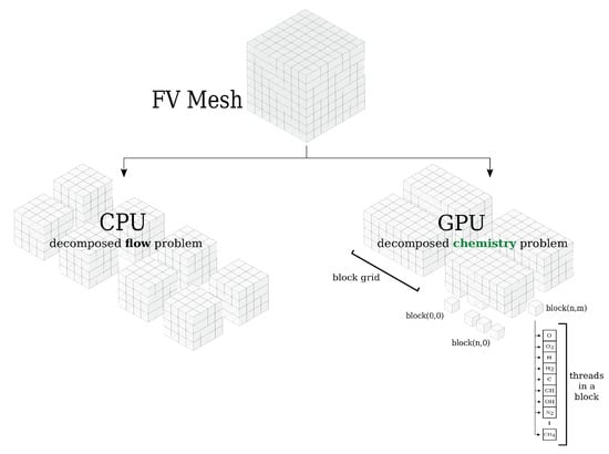 The GPU ODE solver is dynamically linked to the reactive flow solvers available in the open-source software OpenFOAM (Figure 6). Two independent partitionings have been applied to the chemistry problem and the flow domain, respectively. The computational mesh is decomposed into a series of ordered subgroups by a parallel domain decomposition algorithm over the available CPU processor cores. This procedure involves the use of MPI libraries, and is completely independent of the subsequent treatment of the chemistry ODE system. Memory allocation for the transfer of data to the device is produced automatically, ensuring correct memory allocation for each processor based on the available dynamic memory at the beginning of the simulation. Each CPU processor solves the fluid transport, energy, and species transport equations over the assigned subdomain mesh. Multiple GPU cards are managed as a whole and data are synchronized prior to the solution of the fluid transport. At the GPU level, decomposition of the chemical problem is performed independently and relies on a double subdivision over blocks and threads. In particular, each cluster of cells is represented by a series of blocks in which the chemistry problem is solved in parallel; for each block, the solution of the reaction mechanism is parallelized over multiple threads. As a result, double parallelization of the calculation of the chemistry problem on cells/blocks and on species/threads is achieved. As such, three-level parallelization is globally employed, as shown in Figure 6: (a) parallelization of the fluid dynamic problem over CPU processor cores/mesh subdomains; (b) simultaneous solution of the chemistry problem over clusters of cells; and (c) simultaneous/parallel solution of the reaction mechanism in the block threads. The limit on the maximum number of threads per block can be a potential bottleneck for parallelism. This is usually not the case in reactive unsteady CFD simulations, where a 1024-species mechanism is considered a very large mechanism to be solved at run-time. For problems involving larger numbers of species (over a thousand), the thin thread approach [] is preferred.