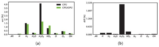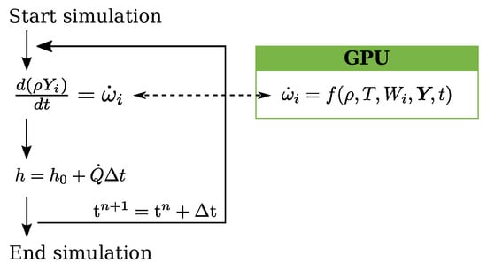 Several algorithmic developments to speed up the solution of ODEs in reactive CFD solvers have been presented over the years in the form of reduction [,], tabulation [,], and Artificial Neural Network-based strategies [,,]. Their success in finite-rate chemistry compared to Direct Integration (DI) is due to their speed, in particular when dealing with detailed mechanisms. On the other hand, they usually require extensive preprocessing operations [] or case-dependent tuning of user-input parameters, which is not required with DI. Heterogeneous GPGPU computing potentially represents a very effective solution to accelerate the DI of chemistry problems, which can be solved on accelerators (GPU) while the fluid transport and turbulence are computed using conventional CPU-based hardware technologies. However, such a strategy requires significant redesign, i.e., software co-design [,].