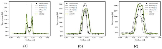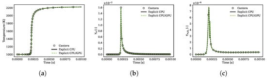 - Auto-ignition in a single-cell batch reactor. This assessment aimed to verify the solution of Direct Integration (DI) of kinetic mechanisms without considering fluid transport calculations. The GPGPU algorithm’s performance was juxtaposed with two alternatives: (a) an equivalent CPU version of the ODE solver already present in OpenFOAM [,] and (b) the solution obtained from Cantera software []. This set of simulations was designed to assess the influence of data transfer latency on the overall computation time and to showcase that the various ODE solvers utilized yielded similar results, facilitating a fair comparison.