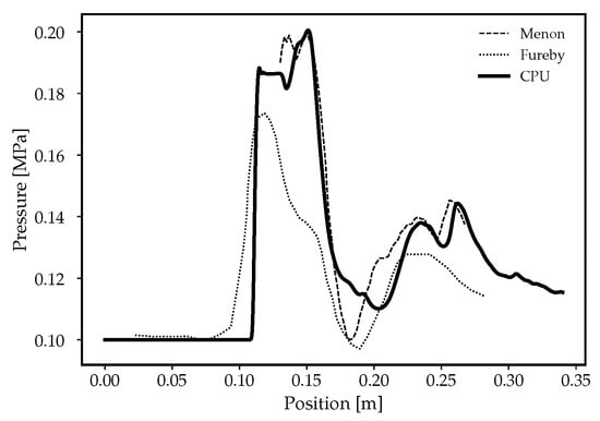 The solution of the chemical mass action (finite-rate chemistry problem) before the flow transport is solved separately for each CV. Reaction rates from calculations of the finite-rate chemistry are passed to the fluid transport problem (Figure 5) as a source term in the species transport equations (Equation (23)). The reaction rate is used by the combustion model to compute the source term (Equation (29)), which in turn is added to the energy equation. In this work, finite-rate chemistry computations are performed on single or multiple Graphical Processing Units (GPUs). Transport properties such as the mass diffusion coefficients, thermal conductivity, and viscosity of the species, along with thermochemical data for the gas phase, are imported from the Cantera transport database through the in-house canteraToFoam utility developed by the authors. As shown in Figure 5, the GPU solver for the finite-rate chemistry can be coupled to any solver available in OpenFOAM, regardless of whether it is pressure-based or density-based. In the following, a shock-capturing density-based solver for the solution of supersonic flows, chosen due to the physics simulated in the validation tests, is used for the fluid transport.