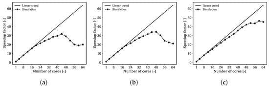However, when combustion with finite-rate chemistry is introduced, the computational load increases, which is due to two factors: (a) the greater number of convection–diffusion equations resulting from tracking intermediate species and (b) the active involvement of finite-rate chemistry ODE solutions. In this scenario, linear scalability is sustained over a broader range of cores (Figure 16c).