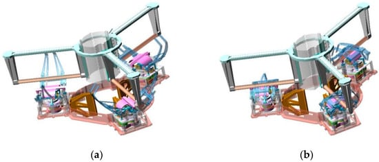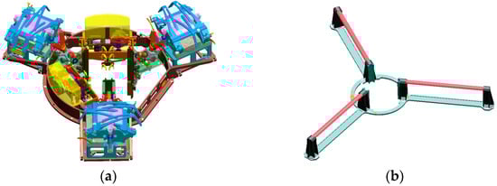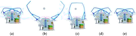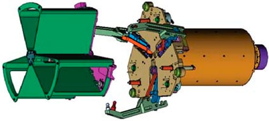 Currently, there have been some studies of active capture docking mechanisms [8]. U.S. Orbit Express is a docking mechanism utilizing a three-finger configuration, which was validated on-orbit in March 2007 [9,10]. The active part contains a three-linked-finger mechanism, seen in Figure 1, which opens its spring-driven fingers before docking to form a large capture space, and is driven by a single motor during the docking process to capture and correct a three-petal passive docking part. The end-effector of the passive part is installed with hooks that cooperate with the fingers to keep the connection. The rubber material at the end of the fingertips provides cushioning and collision force control. However, this three-finger docking mechanism utilizes a central configuration, which is not able to form a natural center channel to transfer the sample or other objects between spacecraft. The docking mechanism of Japan’s Experimental Satellite VII (ETS-VII) utilizes a claw configuration and completed the first on-orbit docking in July 1998 [11,12]. The active part contains three jaw mechanisms, which can be driven independently, and the passive part contains three sets of locking handles, which can realize the capture, correction and connection of two spacecraft. The natural center channel is formed by using the peripheral configuration and can be used for arranging the circuit and liquid replenishment device, but its capture performance is a little poor [12]. The Autonomous Micro-Satellite Docking System (AMDS) led by Michigan Aerospace Corporation (MAC) contains an active part of the retractable flexible rod and a passive part of the tapered structure. The passive part cooperates with the active flexible rod for capture. The magnetic force at the top of the rod achieves initial connection retention, and the flexible rod is pulled back to achieve alignment and structural connection through three locating pins. However, the flexible rod is difficult to validate on the Earth’s gravity [13,14,15], and the centered configuration is not conducive to form the item transfer channel, so AMDS has not been validated yet.