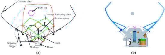 The docking function adopts a modular design, with three sets of claw-type mechanisms evenly distributed along the circumference. Each claw-type mechanism is responsible for capturing and locking one set of locking handles and is capable of realizing the constraint of three degrees of freedom of the locking handles, including two translational degrees of freedom along the X and Z directions and one rotational degree of freedom around the Z axis. The three sets of locking handle axes are not parallel and have an angle of 120° relative to each other. The locking handles enable the three sets of claw-type mechanisms to realize the constraint of the other three degrees of freedom of the locking handle, including the constraint of one degree of freedom of translation along the Y direction and the constraint of two degrees of freedom of rotation around the YZ axis. The combination of three sets of claw-type mechanisms realizes the complete constraint of six degrees of freedom between the active and passive spacecraft, which strengthens the connection’s load-bearing capacity. The working principle of the claw mechanism is shown in Figure 4, where the mechanism in the open-claw position is shown in Figure 4b in order to better understand the working principle in Figure 4a. Two sets of crank-rocker four-link mechanisms are used, including drive crank, intermediate linkage, rocker, capture claw and housing. The left and right claws are fixedly connected to the rockers in the two sets of four-link mechanisms. The rocker can drive the claws for a wide range of capturing, correcting and locking motions because it is capable of a wide range of motion. The left and right cranks are connected together by bevel gears. The two cranks are driven by a drive mechanism to synchronize the reverse movement of the two cranks.