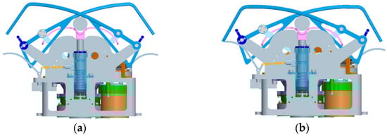 Based on the design of the claw-type docking mechanism, using MSC ADAMS software, a digital prototype simulation model was established, seen in Figure 16. The model was used for the simulation and analysis of docking dynamics, and Figure 16a shows the initial state of docking, and Figure 16b shows the final state of docking.
