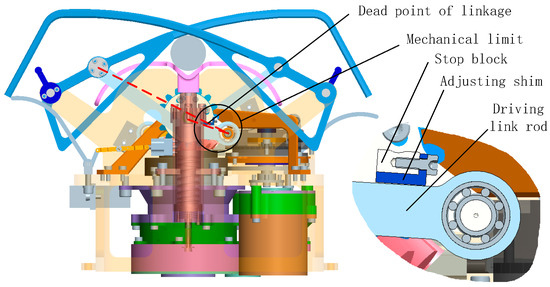 A V-block is installed in the center locking position of the claw-type mechanism for correction and positioning. The V-block and the left and right locking claws work together to realize the positioning correction of the locking handle in Figure 5a. The claws are locked in position by means of a dead center plus mechanical limits and a unidirectional transmission of the claw drive; the locking position can be seen in Figure 5b. The dead point and mechanical limit principle are shown in Figure 6. By combining the dead point and mechanical limit, the mechanism can maintain the locking position.