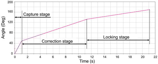 In order to ensure the different requirements of different working stages, in the capture stage, the motor works in high speed to realize the fast closing of the claw. In other stages, the motor speed is appropriately reduced to realize slow correction and locking so that the positioning accuracy of docking can be improved. The total stroke of the rotation is about 170° from the open state to the end of the locking. The whole stroke is divided into several stages, such as capture, correction and locking, and can be finished in 21 s [17], seen in Figure 7. After the docking is completed, if the separation function needs to be performed, the claw-type mechanism can be actively opened to release the lock handle. This gives the docking mechanism the ability to repeat the docking process on orbit in order to deal with various failures during the mission.