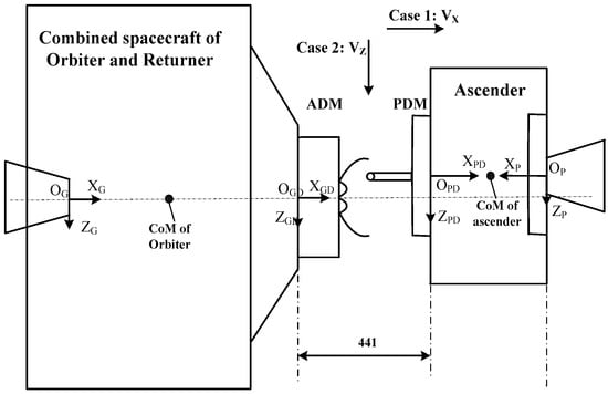 The Lunar Sample Return Explorer consists of an orbiter, a returner, a lander and an ascender. During rendezvous and docking on lunar orbit, the ascender (the right side in Figure 2), which carries the sample container, acts as the target spacecraft and is fitted with a passive docking mechanism, while the combined spacecraft of the orbiter and returner, consisting of the orbiter and the returner, is fitted with an active docking mechanism and acts as the tracking spacecraft (the left side in Figure 2).