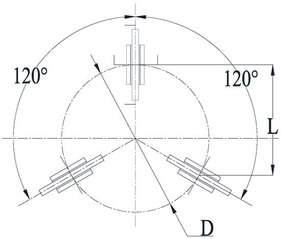 The claw-type mechanism adopts a crank-rocker mechanism to drive the connecting rod over the dead center to realize the self-locking of the mechanism in the locking state. In addition, the claw drive mechanism is also self-locking in the reverse direction. Therefore, in the locked state, the load-bearing function of the docking mechanism is mainly realized by the locking claw structure. In order to maintain the locking state, the load capacity of the combination of multiple claw-type mechanisms should be larger than all external superimposed loads. The worst case of a moment load is the sum of the moment equivalent tension and external tension in one single set of claws. For the three-point layout, the bending moment formed by rotating around the axis of the two sets of claws produces the greatest tensile load on a single set of claws. The corresponding flipping arm of force is, in the case of a 120° distribution of the three locking points, equal to 1.5 times the radius of the distribution circle, seen in Figure 12.