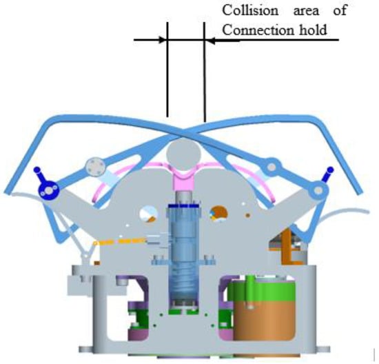 The claw docking mechanism adopts a modular design. Three sets of claw-type mechanisms work independently to move synchronously to realize the docking function. The working process of a single claw is shown in Figure 8. During the launch, the claw-type mechanism is retracted to reduce the overall height of the whole detector system. In order to fulfill the capture function, the capture mechanism needs to satisfy the inclusiveness requirement with respect to the maximum positional deviation of the locking handle. Before executing the capture command, the capture mechanism is able to adapt to the positional inclusion requirement under the combination of the various positional deviations of the initial conditions, allowing the locking handle to enter into the space that can be captured by the holding claw. When the capture action is executed, the claw can form a closed capture space to the locking handle to ensure reliable capture. The correction process will eliminate the positional deviation between the two sets of docking mechanisms and ensure the alignment of the center axis of the spacecraft, laying the foundation for the subsequent sample transfer mission. The claw mechanism would be subjected to multidirectional loads between the docking surfaces to ensure the stiffness of the connection between the spacecraft.