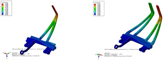 Using Abaqus/Stand 6.11-2 software, finite element modeling analysis was applied for the designed claws. A desired payload was applied to the claw-type structure at the nominal height to analyze the structural deformation and stiffness performance, seen in Figure 15. From the figure, it can be seen that the average stiffness of the working section of the single-finger claw during capture correction is 22.1 N/mm, and the average stiffness of the working section of the double-finger claw during capture correction is 22.0 N/mm. The maximum deformation under the collision load is about 7.6 mm. The working section for the connection hold of the left and right claws was strengthened to have higher stiffness, with an average stiffness of 95 N/mm, which meets the requirements for the connection hold process.