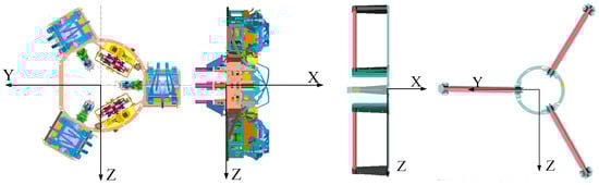 To accomplish the docking mission between the tracking spacecraft and the target spacecraft on lunar orbit, a new active capture claw-type docking mechanism is designed, consisting of two parts, the Active Docking Mechanism (ADM) and the Passive Docking Mechanism (PDM), seen in Figure 3. The docking mechanism adopts a peripheral configuration with a natural channel formed in the center for sample transfer. The active docking mechanism consists of three sets of independently actuated gripper mechanisms, which are responsible for capture correction and connection hold functions. The passive docking mechanism consists of three sets of locking handles, which are distributed in the circumferential position. It has a simple structure and is lightweight; thus, it has significant advantages in the processes of lunar landing, lunar surface work and ascent and takeoff.