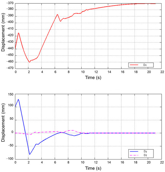 The docking surface coordinate system definition is given in Figure 17. Figure 18 shows the curve of the relative displacement of the docking surface. It can be seen that under the coordinate system of the docking mechanism, the relative displacements of the two spacecraft in three directions gradually converge from the initial deviation to zero, indicating that the docking mechanism is able to accomplish the capture correction successfully.