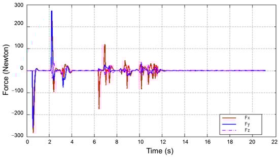 Figure 19 shows the curve of the collision force of the docking mechanism. It can be seen that a slight collision occurred between the docking mechanisms during the docking process. The correction process works successfully. Maximum x-direction collision force is about 290 N; maximum y-direction collision force is about 280 N; maximum z-direction collision force is about 240 N; and the collision load is no more than 300 N. As a result, the stiffness of the docking mechanism is reasonably designed.