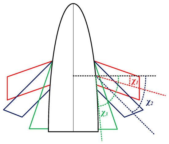 The aircraft is composed of a body and foldable wings and adopts bank-to-turn (BTT) control with no thrust. The sweep angle of the wing can form three fixed sizes, χ1 = 30°, χ2 = 45°, and χ3 = 80°, respectively, as shown in Figure 1.