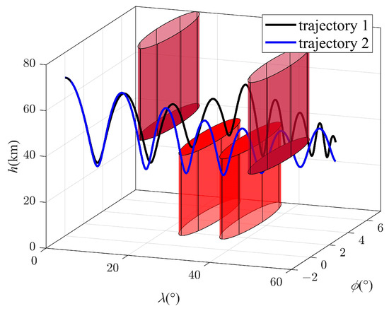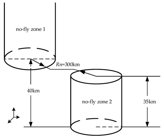 In this paper, two types of no-fly zones are considered. Type 1 is a high-altitude no-fly zone, whose model is a cylinder with a base surface of h = 40 km and a radius of Rn = 300 km. Type 2 is a low-altitude no-fly zone, whose model is a cylinder with a base surface on the ground, a top surface 35 km high, and a radius of 300 km. The two types of no-fly zones are shown in Figure 2. The model of the no-fly zone is given as: