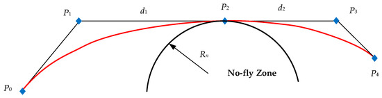 - Augment the initial control point set. The initial augmentation control point is located on the initial heading to ensure the initial heading angle and the intermediate augmented control points are located on both sides of the tangent points; then, the control point set is obtained. The initial position P0 and end position Pn of the curve correspond to the initial position of the aircraft and the target. In order to ensure that the aircraft can avoid the threat area, the aircraft must be on the other side of the threat area’s tangent line. Therefore, the B-spline curve is designed to be tangent to the circle of the zone. According to the characteristic of the curve, the tangent point can be the middle point of three collinear control points. Then, adjust the distance d1 and d2 between the two adjacent control points to control the curvature of the curve near the tangent point so that it does not intersect the circle, as shown in Figure 3. In the figure, P0~P4 are the control points, and the red spline curve is tangent to the no-fly zone, preventing the curve from crossing the zone.