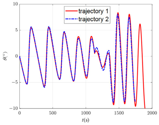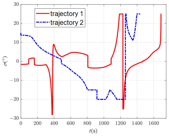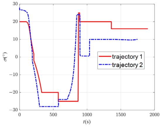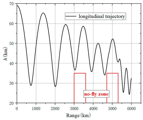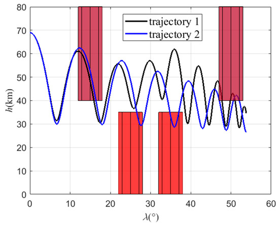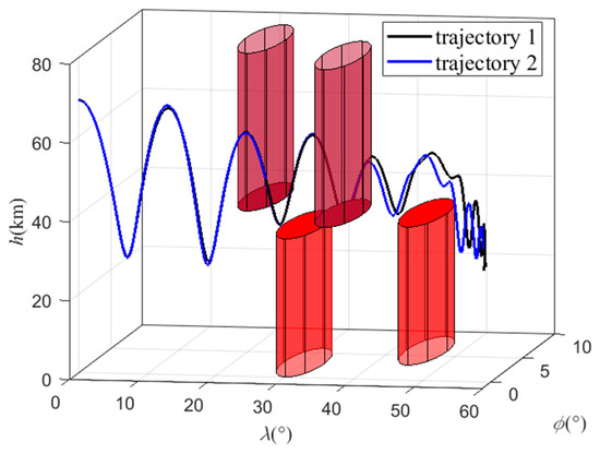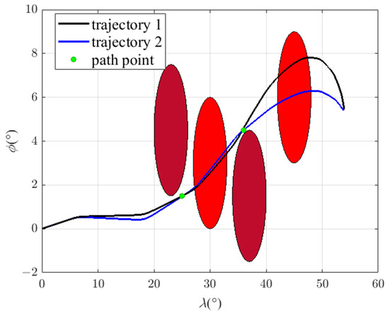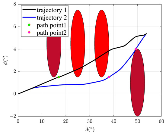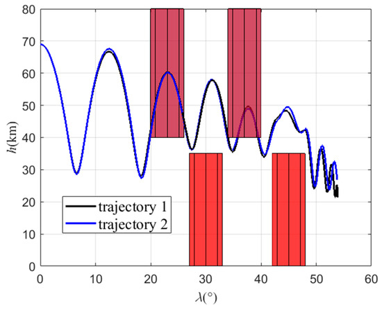 In order to explore the influence of changing the swept wing to avoid the no-fly zones on the trajectory, there are two trajectories in this scenario. In trajectory 1, the improved algorithm is used for simulation. In trajectory 2, the aircraft avoids the no-fly zones only through lateral maneuvers; that is, only the bank angle is adjusted, while the attack angle is fixed at 5° and the sweep angle is fixed at 45° during flight, producing the maximum lift–drag ratio. The locations of the no-fly zones are different in scenario 2. There are two type 1 no-fly zones, with centers located at (15°, 4.5°) and (50°, 1°), and two type 2 no-fly zones, with centers located at (25°, 4.5°) and (35°, 4.5°). All the parameters of this scenario are shown in Table 5. The flight path point is obtained via the B-spline curve scheme, and the command of the bank angle is obtained via the MCRL method.