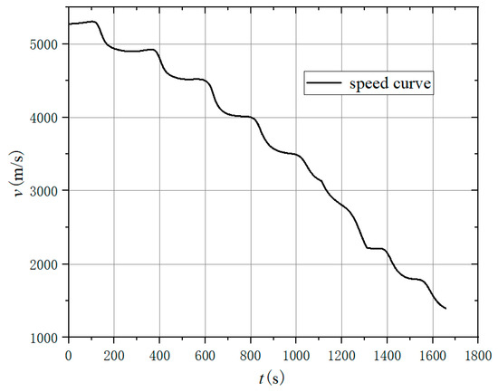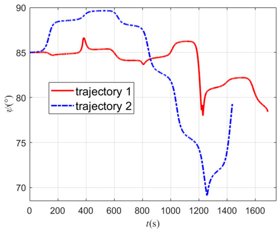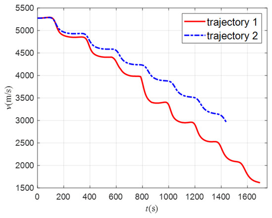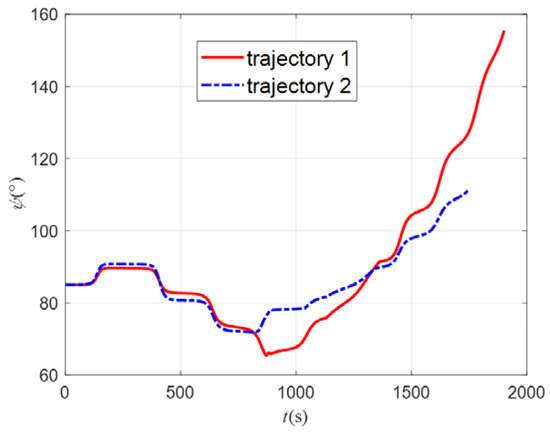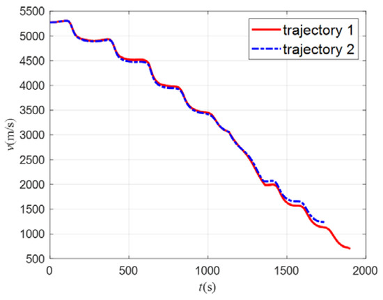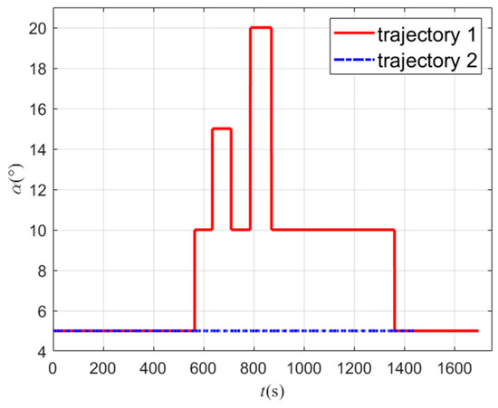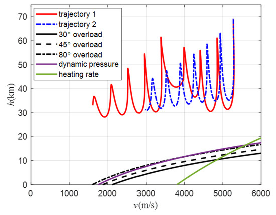 According to the 3D, longitudinal, and lateral trajectories shown in Figure 24, Figure 25 and Figure 26, the aircraft can reach the target and avoid the no-fly zones using both methods. Trajectory 1 can cross two type 2 zones (light red) from the top and avoid two type 1 zones (dark red) from the side. Trajectory 2 can avoid all zones from the side. Both trajectories can fly through the planned path points. Because trajectory 2 flies around all the no-fly zones, its trajectory has a larger turn than trajectory 1. Figure 27 shows the curves of the attack angle, and Figure 28 shows the curves of the sweep angle. The curve of trajectory 1 changes in order to avoid the type 2 zones, which are obtained via Q-learning. The curves of trajectory 2 are fixed sets. Figure 29 shows the bank angle curves, which are obtained using the bank angle scheme. Figure 30 shows the speed curves, and it can be seen that the final velocity of trajectory 1 is 1650 m/s, which is smaller than the 2980 m/s velocity of trajectory 2. The trend of velocity change is the same as in Figure 8. This indicates that in order to fly over the top of the no-fly zones, more energy must be consumed, so the speed will be lowered, and the trajectory will take more time. The flight path angles of the two trajectories are shown in Figure 31. It can be seen in the figure that the flight path angle curves both show oscillatory changes. The absolute value of trajectory 1 is not greater than 8°, while the absolute value of trajectory 1 is not greater than 5°. This is because trajectory 1 needs to fly higher to avoid the no-fly zone, so its path angle will be larger to raise the altitude of the trajectory, which causes the decrease in speed. The heading angle is shown in Figure 32. The change in the heading angle of trajectory 2 is larger than trajectory 1, indicating that in order to achieve the avoidance of the no-fly zones, its trajectory needs to have a larger turn, so a more drastic course angle change is generated. The h-v flight profile is shown in Figure 33. It can be seen that the h-v curves of the aircraft are all above the three overloads, heating rates, and dynamic pressure curves, indicating that the two trajectories both meet the constraints of the aircraft.