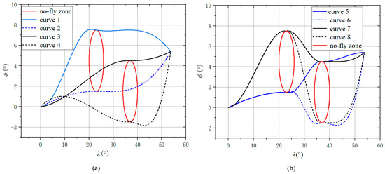 It should be noted that the curve is not the lateral trajectory of the aircraft, so its length cannot represent the flight range and its curvature cannot represent the overload of the aircraft. However, as characteristics of the curve, these elements can be used to evaluate the performance of the curve. The optimal B-spline curves are obtained through optimization. Curves that cross the no-fly zones are discarded, and then the one with the best performance index from all curves is selected.