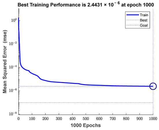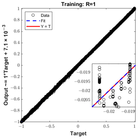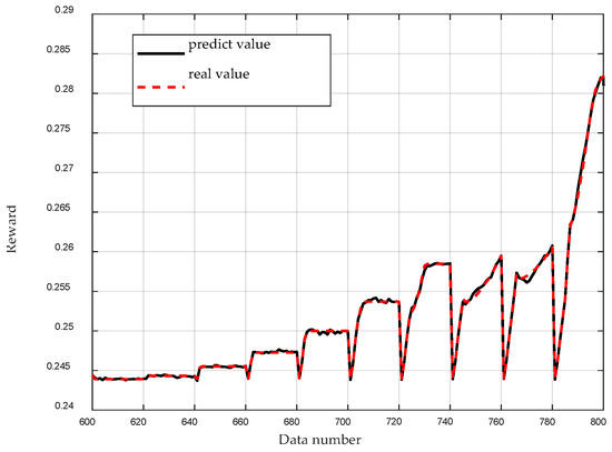 In the above results, it can be seen that when the number of iterations reaches 1000, the mean square error of the network converges to 9.2425 × 10−7, which meets the requirement. The sample regression performance indicator R = 1 indicates strong data regression. As shown in Figure 14, the test results basically coincide with the sample. The above results demonstrate the good fitting ability of the DNN, which can achieve an accurate and fast estimation of the rewards.