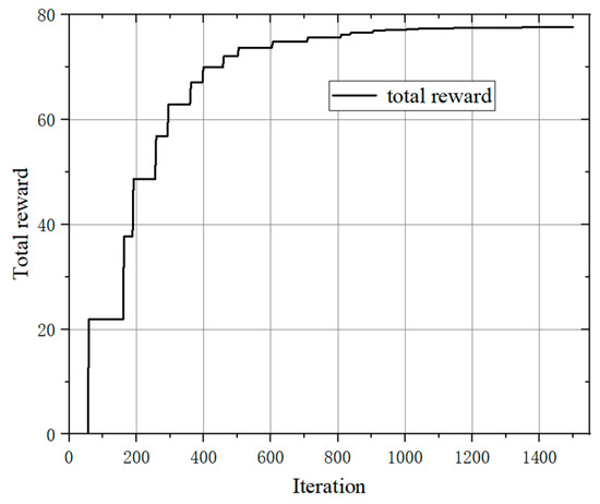 The total reward increases rapidly before 800 iterations; then, the increase tends to converge after 1000 iterations. The value is about 78.