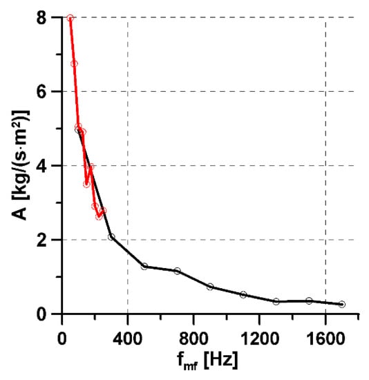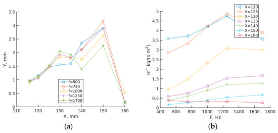 The summarized results of the experiments are presented in Figure 15. In Figure 15a, the vertical position of the RMS maximum along the plate for different frequencies fmod can be observed. Since some profiles of the RMS pulsations of mass flow exhibited two maxima, it was decided to analyze only the peak closer to the boundary layer edge. This approach assumes that it allows for the examination of the development of a single type of disturbance. It is evident that the position of the peak weakly depends on the frequency and for the most part moves away from the wall with increasing longitudinal coordinate due to growth of the boundary layer thickness, except for the section at X = 160 mm, where the disturbance amplitudes approach zero.