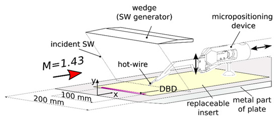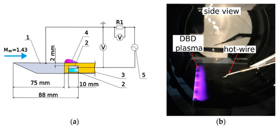 The DBD used in these experiments has the following construction: the metallic part of the model served as the open electrode, connected to the grounded part of the discharge power circuit (Figure 4a). The X-coordinate of 75 mm corresponds to the beginning of the dielectric insert. This position of the insert and, consequently, the DBD, was chosen based on the design features of the model to maximize the distance between the disturbance source and the SWBLI zone. To accommodate the second electrode in this insert, a slot with a width of 100 mm along the span was made, where the closed electrode was placed. This electrode was coated with epoxy resin to prevent plasma discharge on the opposite side of the model. The length of the electrode along the X-axis was 10 mm, and the distance between the electrodes in the X-direction was 3 mm. The thickness of the dielectric between the lower electrode and the flow was 2 mm. In the photo in Figure 4b, the plasma region on the model surface and the CTA sensor are visible. It can be observed that the discharge is more stratified in the region between the electrodes, while the glow above the lower enclosed electrode is more homogeneous.
