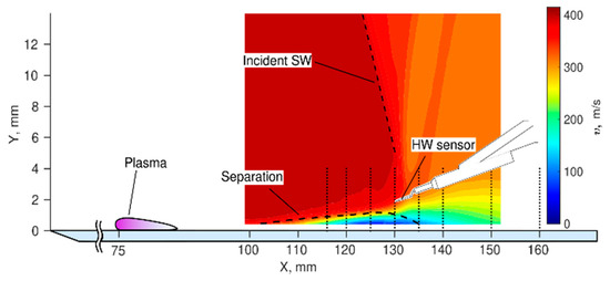 Additionally in this figure, a schematic representation of the plate model, the CTA sensor, and the plasma region located 75 mm from the leading edge of the model and spanning 13 mm are depicted. Vertical dotted lines in X = 116, 120, 125, 130, 135, 140, 150, 160 mm in the figure, show the sections in which hot-wire measurements were carried out by scanning along the Y axis. It is evident that the measurements in the range of X = 116–130 mm were performed in the laminar separation region. At the coordinate X = 135 mm, the impinging shock wave intersects with the boundary layer, leading to the formation of a strong adverse pressure gradient. This leads to the laminar-to-turbulent transition, characterized by an increase in the velocity profile filling of the boundary layer and a sharp growth in its thickness. The turbulent wake behind the SWBLI zone is located in the range of X = 135–160 mm.