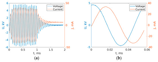 Figure 5 shows examples of current and voltage oscillograms on the DBD for the case of fmod = 500 Hz during one modulation period, T = 1/fmod, as shown in Figure 5a, and during one carrier signal period, T = 1/fcarry, as shown in Figure 5b. From Figure 5a it can be observed that the system exhibits inertia and requires several periods of oscillations at the carrier frequency for the voltage and current amplitudes to reach the desired value. Inertia is also observed during the decay. The oscillogram in Figure 5b was obtained by averaging the oscillogram in Figure 5a over a time interval from 0.28 ms to 0.8 ms, covering a whole number of oscillations at the carrier frequency.