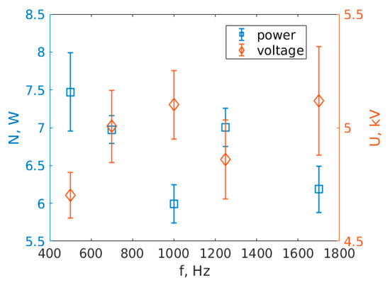 Figure 6 presents the values of electrical power consumed by the DBD and the voltage amplitudes on the electrodes as a function of the modulation frequency. The average values shown by the symbols, as well as the magnitude of the confidence intervals, were calculated for each fmod based on eight measurements taken at different positions along the X-axis. As can be seen from this figure, there is a variation in voltage amplitude of approximately ±8% and in power of approximately ±17% during the experiments. However, further data analysis revealed that this variation does not have a significant impact on the development of disturbances and is likely to have a weak effect on their initial amplitude.